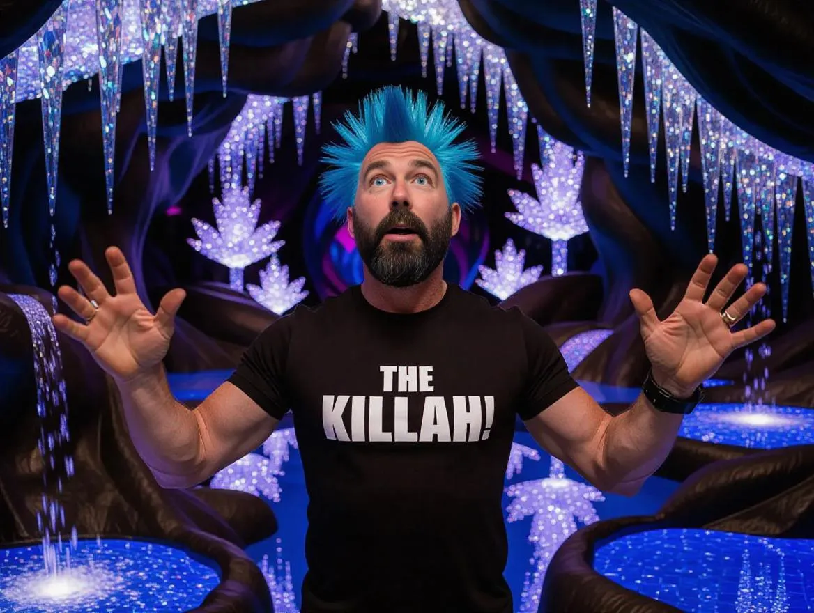 A wild and eccentric Australian man with vibrant blue spiked hair and a rugged black beard, wearing a snug black t-shirt emblazoned with the bold phrase 'The Killah!' in striking white letters, stands in awe within a breathtaking world of shimmering crystals. Every surface reflects a kaleidoscope of colors and light, with fantastical crystallized trees and sparkling waterfalls cascading into pools of radiant light. His eyes sparkle with wonder, reaching out to touch the glittering structures, reflections dancing around him, creating a magical atmosphere of adventure and discovery.