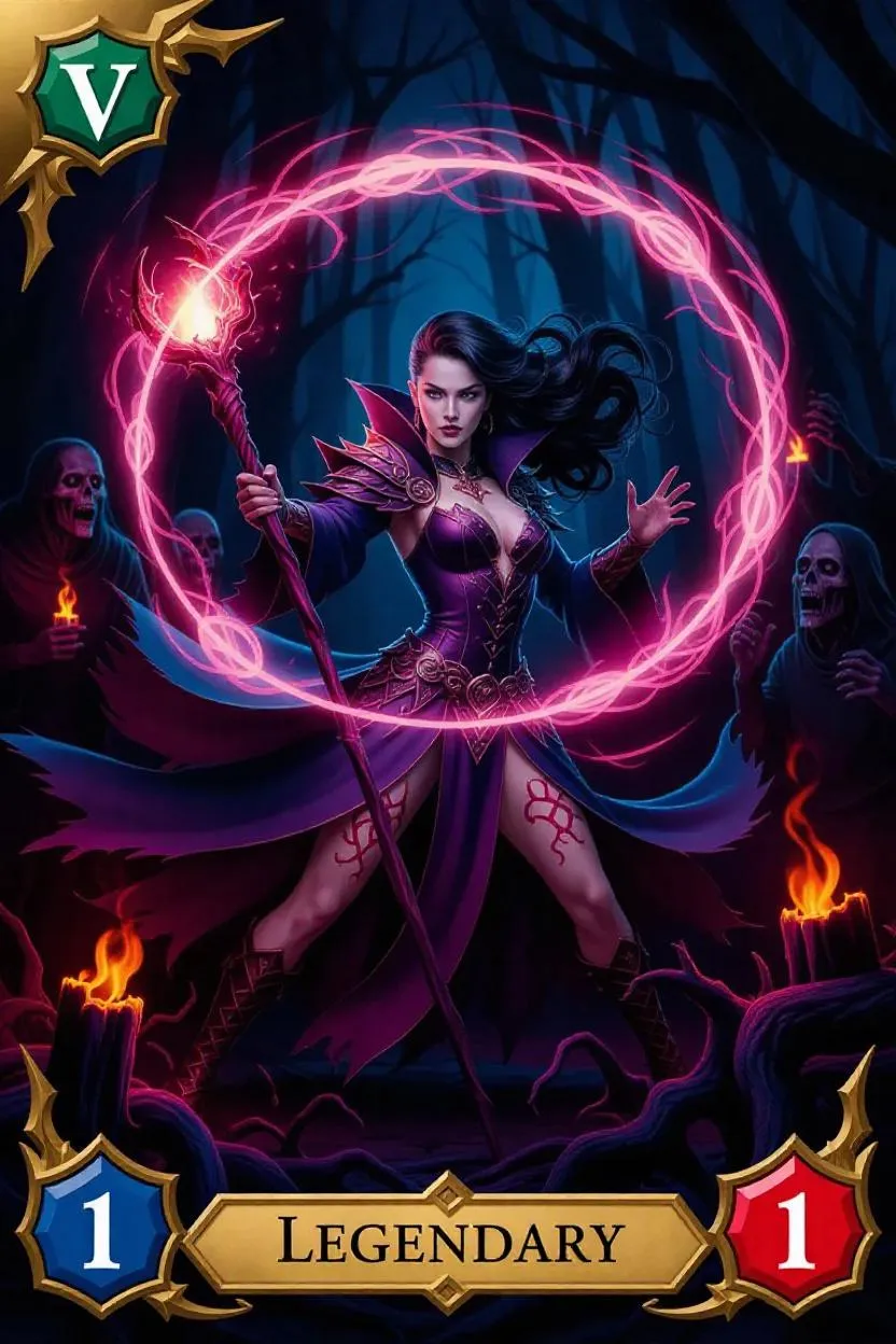 A heroic sorceress summoning a swirling vortex of magical energy while wielding a blood-stained staff, surrounded by glowing runes, stands confidently in a dark, mystical forest, lit by eerie, flickering torches, as undead creatures and twisted tree roots emerge from the shadows. Her long, raven-black hair flows wildly around her face, accentuating her determined expression. A faint, eerie glow emanates from her hands, illuminating intricate, crimson-red tattoos. The card showcases a fantasy horror style with a rarity symbol of 'Legendary' in the corner, denoting her incredible power. A golden border frames the image, signifying her allegiance to the 'Order of the Ancients' faction.