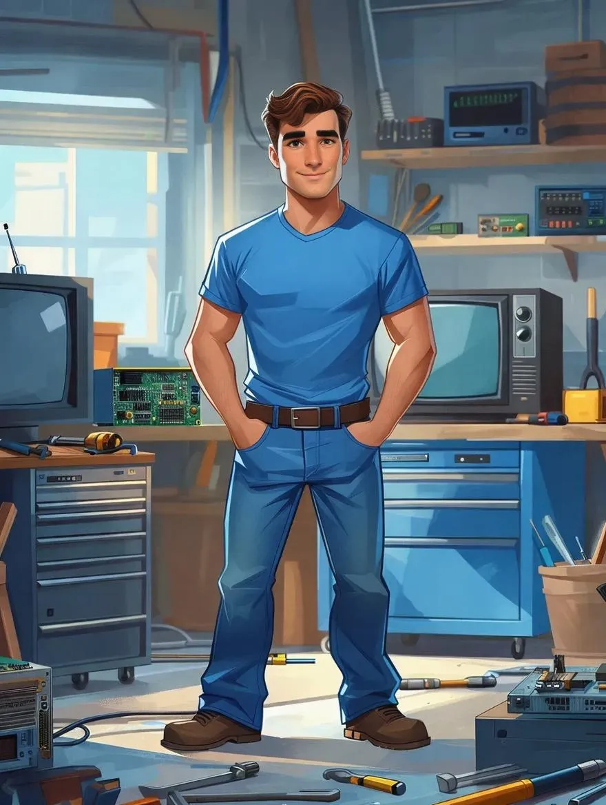 Generate a playful cartoon-style AI image of a TV service technician in a blue t-shirt and jeans, holding a soldering iron with tools scattered below. Perfect for tech-themed visuals, this vibrant design combines professional AI editing with whimsical details for engaging content creation.