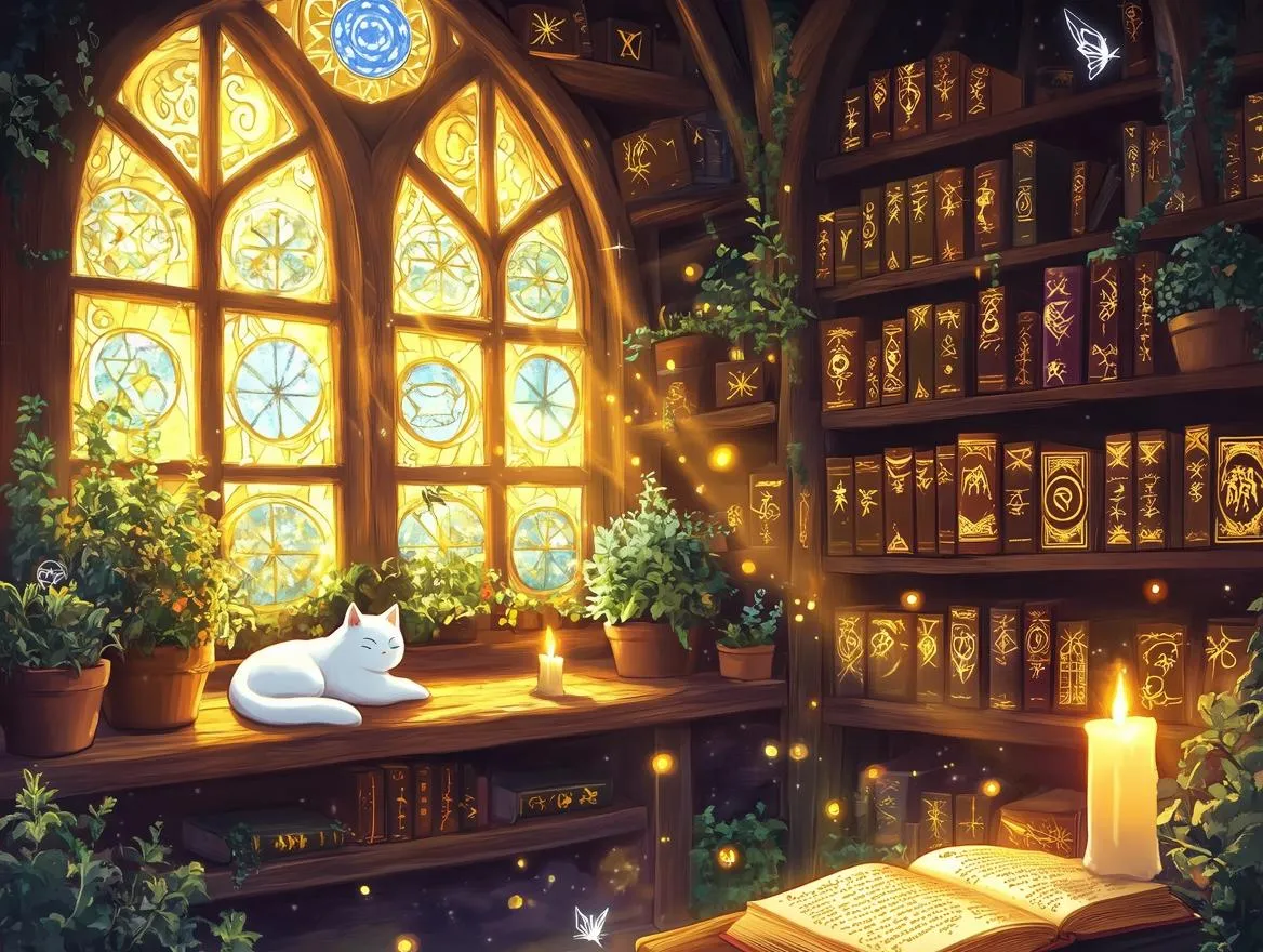 Create a cozy Ghibli-inspired anime library scene with golden sunlight, celestial stained glass, glowing rune-covered tomes, and a mystical white cat. Serene watercolor textures blend rustic charm and whimsical fantasy. Craft cinematic AI art at Vivago.ai for enchanting magical villages, glowing grimoires, and ethereal dust motes in a Studio Ghibli-style whimsical, cinematic anime atmosphere.