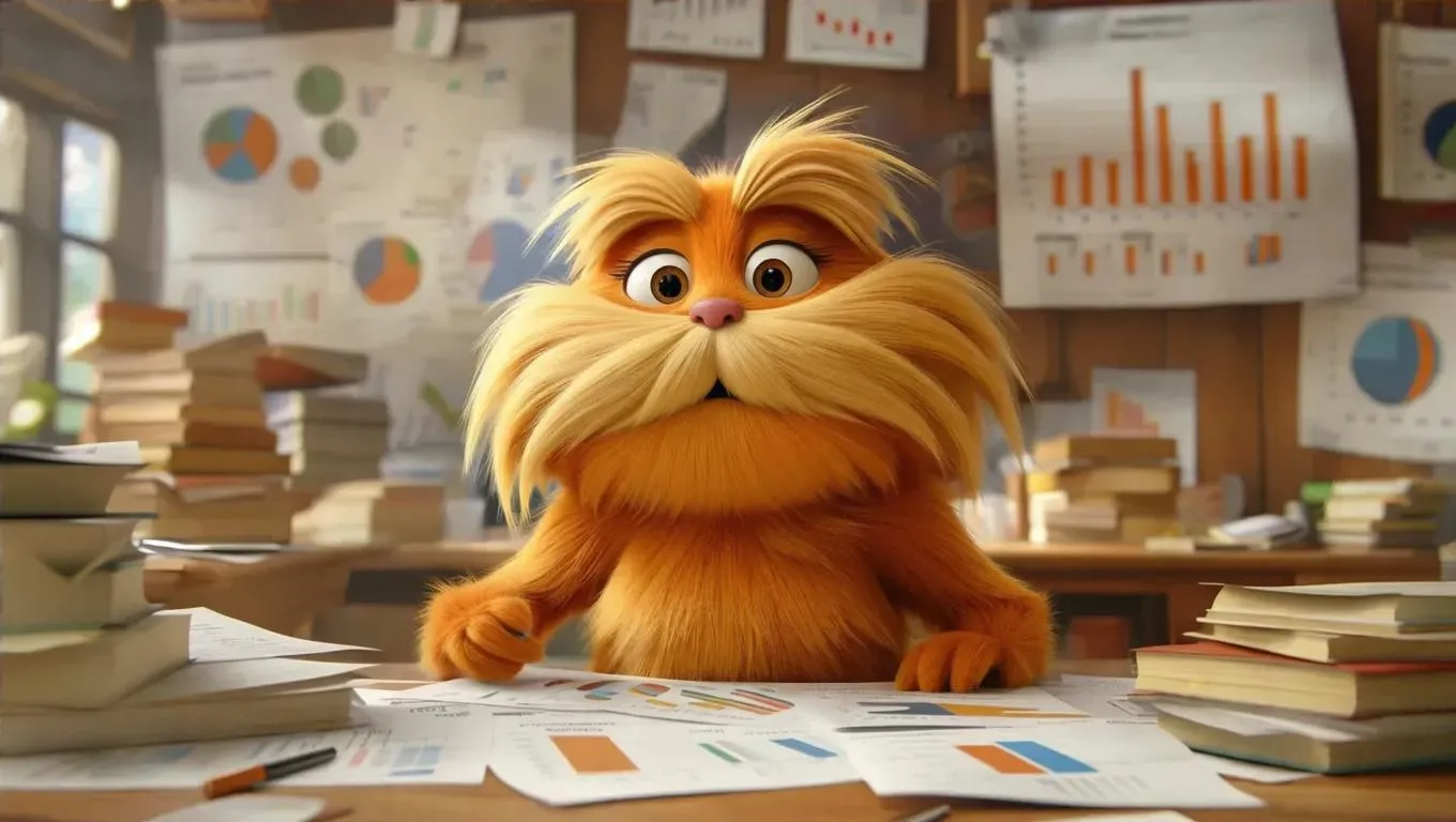 Transform your vision with vivago.ai's AI image generator. Depict the Lorax analyzing data, surrounded by dynamic stats, floating numbers, and scattered paper sheets. Elevate storytelling with AI-powered visuals, blending creativity and analytics for professional-grade, data-rich digital art. Perfect for stats visualization and imaginative projects.