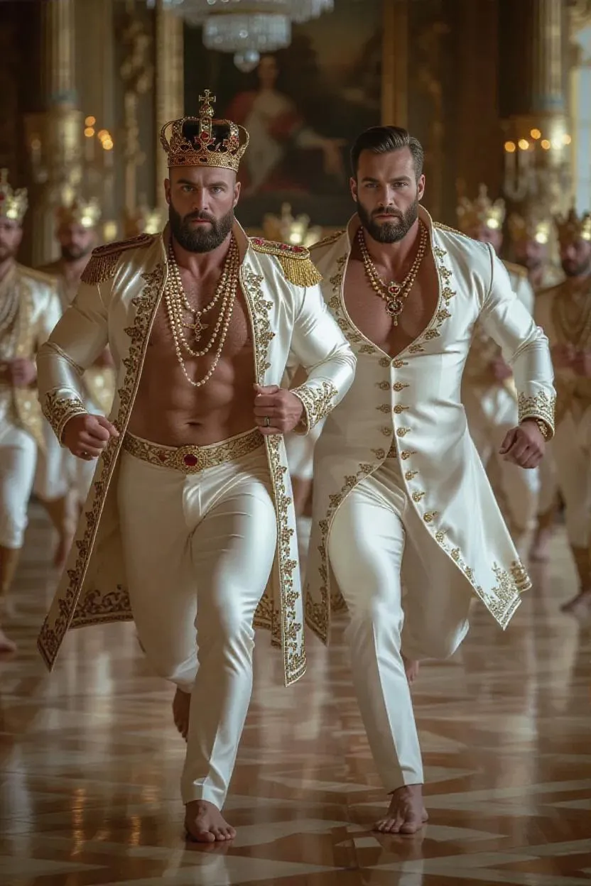 Dramatic AI-generated image of a muscular English king and his lover fleeing palace soldiers during a lavish golden ball. Traditional ornate garments, chunky gold jewelry, and pearl/ruby decor highlight their physiques. Realistic HD scene blends historical romance, opulent interiors, and high-stakes escape with intricate details and cinematic quality.