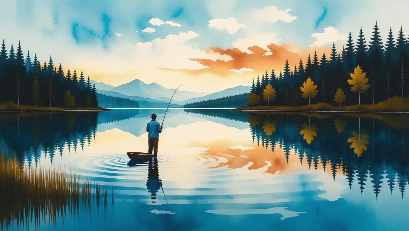 Create serene AI watercolor art with vivago.ai: Generate a black man fishing on a tranquil lake, blending dominant blue, brown, and green hues for natural, professional-grade imagery. Transform prompts into vivid, peaceful scenes effortlessly.