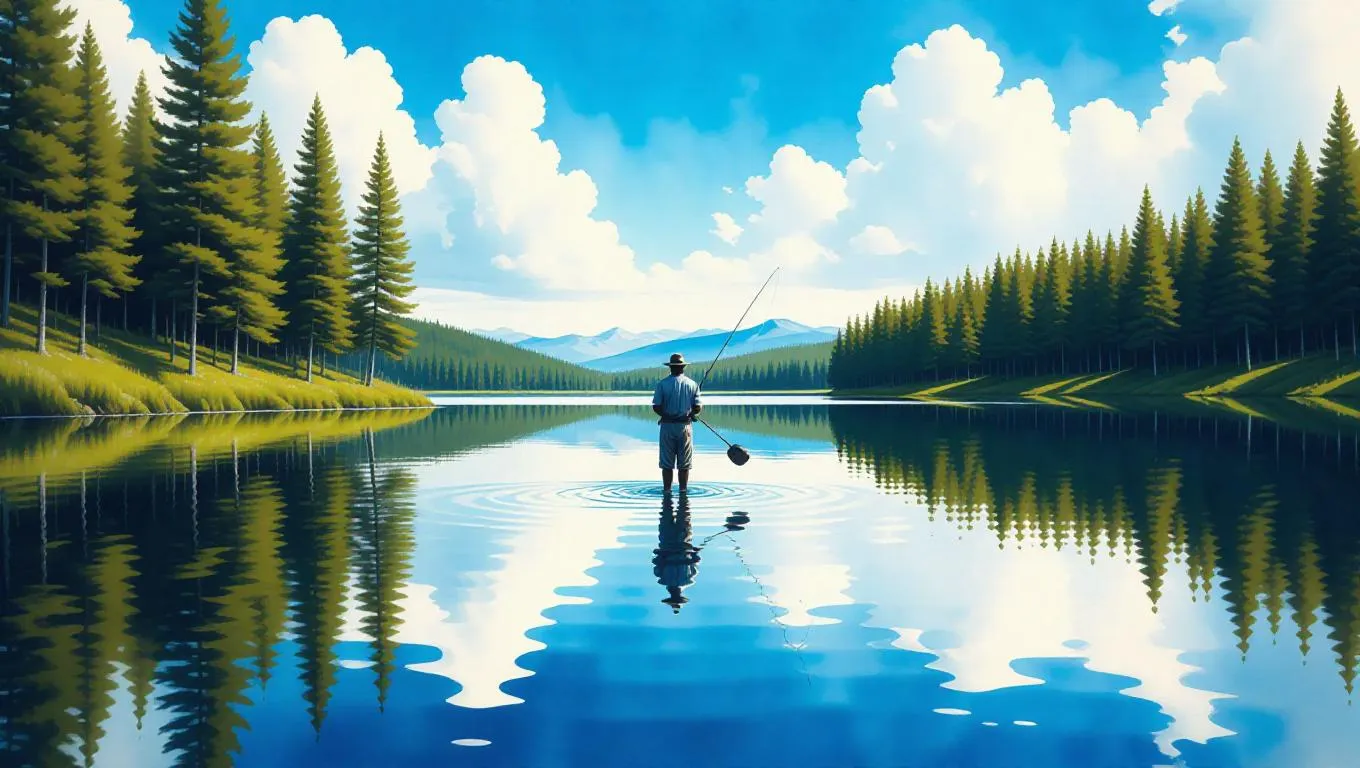 Create serene AI watercolor art with vivago.ai: Generate a black man fishing on a tranquil lake, blending dominant blue, brown, and green hues for natural, professional-grade imagery. Transform prompts into vivid, peaceful scenes effortlessly.