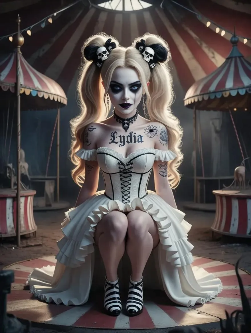 Vibrant AI-generated goth bride art: ethereal, dark fantasy portrait with intricate details—blonde space buns, skull barrettes, spider necklace, corpse-like makeup. Set in an eerie circus, illuminated by vibrant backlighting and ethereal hues. UHR C4D style, 1:9 aspect ratio. Create striking AI visuals with vivago.ai’s advanced tools for surreal, high-detail dark-themed masterpieces.