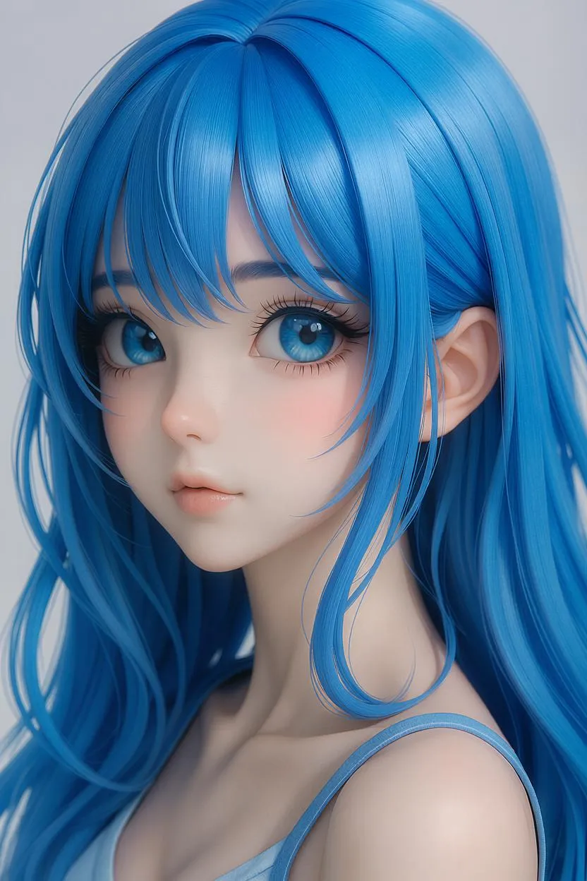 Generate detailed 3D anime art of a beautiful blue-haired girl. Create profile close-ups with fair skin, big expressive eyes, long eyelashes, and defined facial modeling. Perfect AI character design for vivid anime portraits showcasing elegant features like high nose bridges.