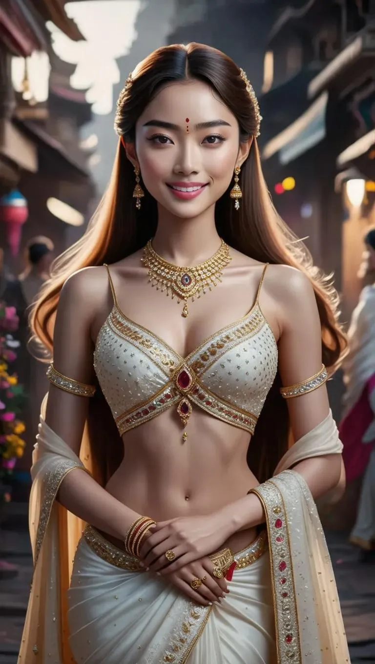 Explore a high-resolution AI-generated image of a biomechanical Asian woman in an elegant gold-accented sari, blending human-machine fusion. Set in a vibrant Hindu city with Rembrandt lighting, this 3D rendering features a sunset backdrop, intricate details, ruby jewelry, and mystical atmosphere for a captivating visual masterpiece. Perfect for futuristic fashion and conceptual art enthusiasts.
