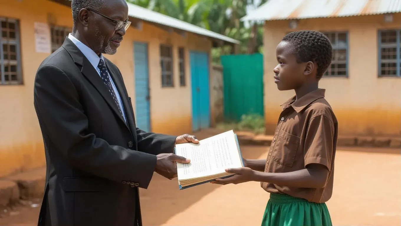 Generate an AI-powered image of a heartfelt scholarship ceremony: a 50-year-old man in a black suit gifts school supplies to 11-year-old Tunde wearing torn clothes. Visualize contrasting textures - crisp formalwear vs weathered brown shirt/green shorts - with symbolic books and academic items, capturing generosity and transformative educational opportunities through vivid AI art.