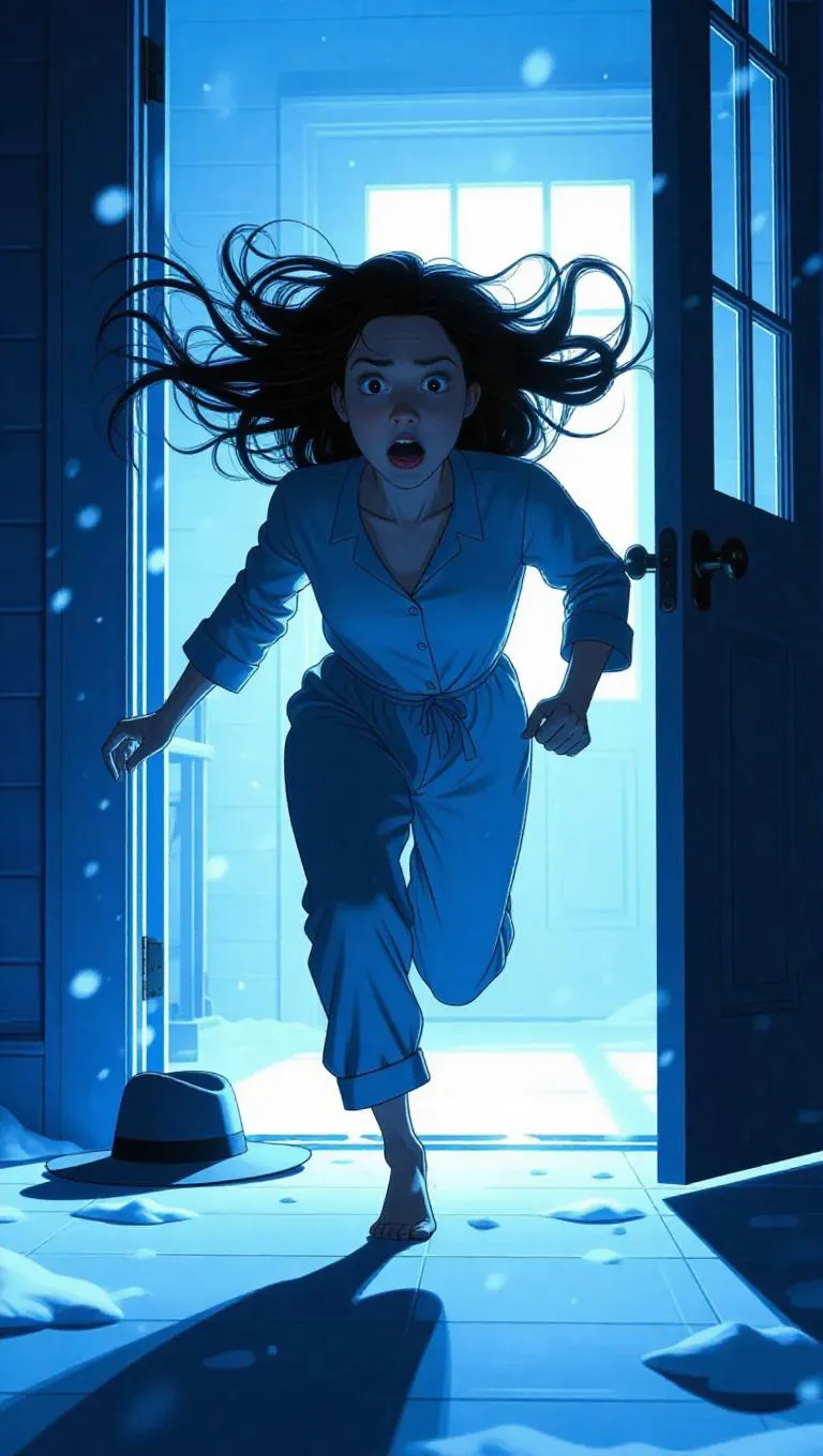 Generate chilling 2D cartoon scenes with AI: terrified barefoot woman fleeing into icy night, windblown pajamas, dropped hat, raw fear expressions. Transform text prompts into suspenseful animations using Vivago.ai's horror-themed AI effects and professional editing tools for vivid storytelling visuals.