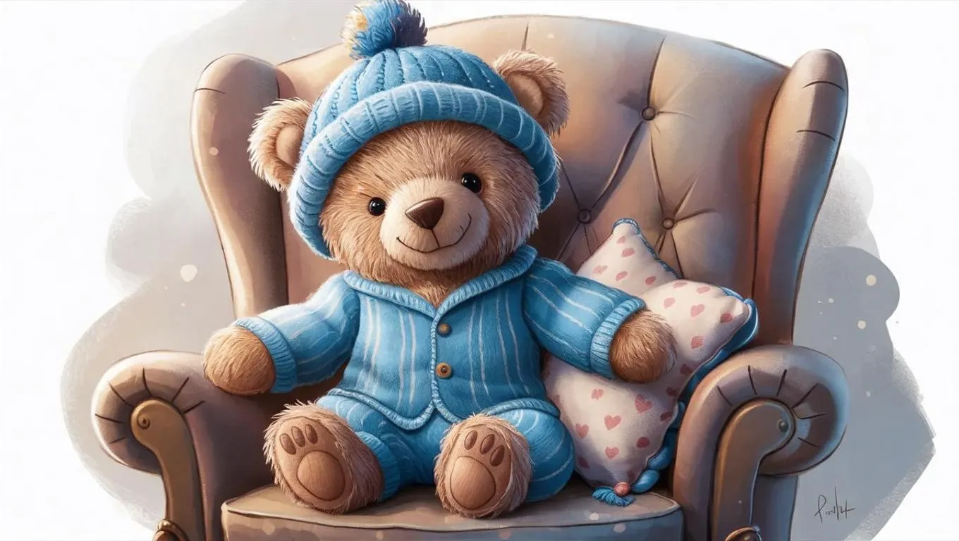 Create an AI-generated image of a stuffed teddy bear wearing blue pajamas and a pom-pom hat, hugging a pillow. Ideal for children's stories, nursery decor, or cozy-themed visuals. Transform prompts into charming designs with VivaGo.ai's AI image tools for professional creative projects.