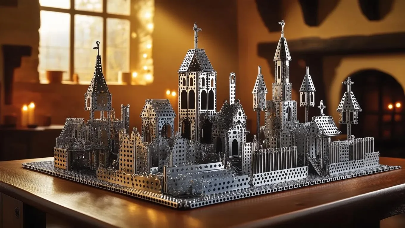 Craft a medieval Meccano township diorama with perforated metal strips, gothic chapels, taverns, and forts. This Idea Set blends Victorian-era architecture, metallic light reflections, and golden ambiance for a fantasy vibe. Showcase mechanical ingenuity with intricate designs, curved plates, and flexible parts, evoking craftsmanship and wonder in a warmly lit, dreamlike setting. Perfect for AI-generated creative builds merging history and innovation.
