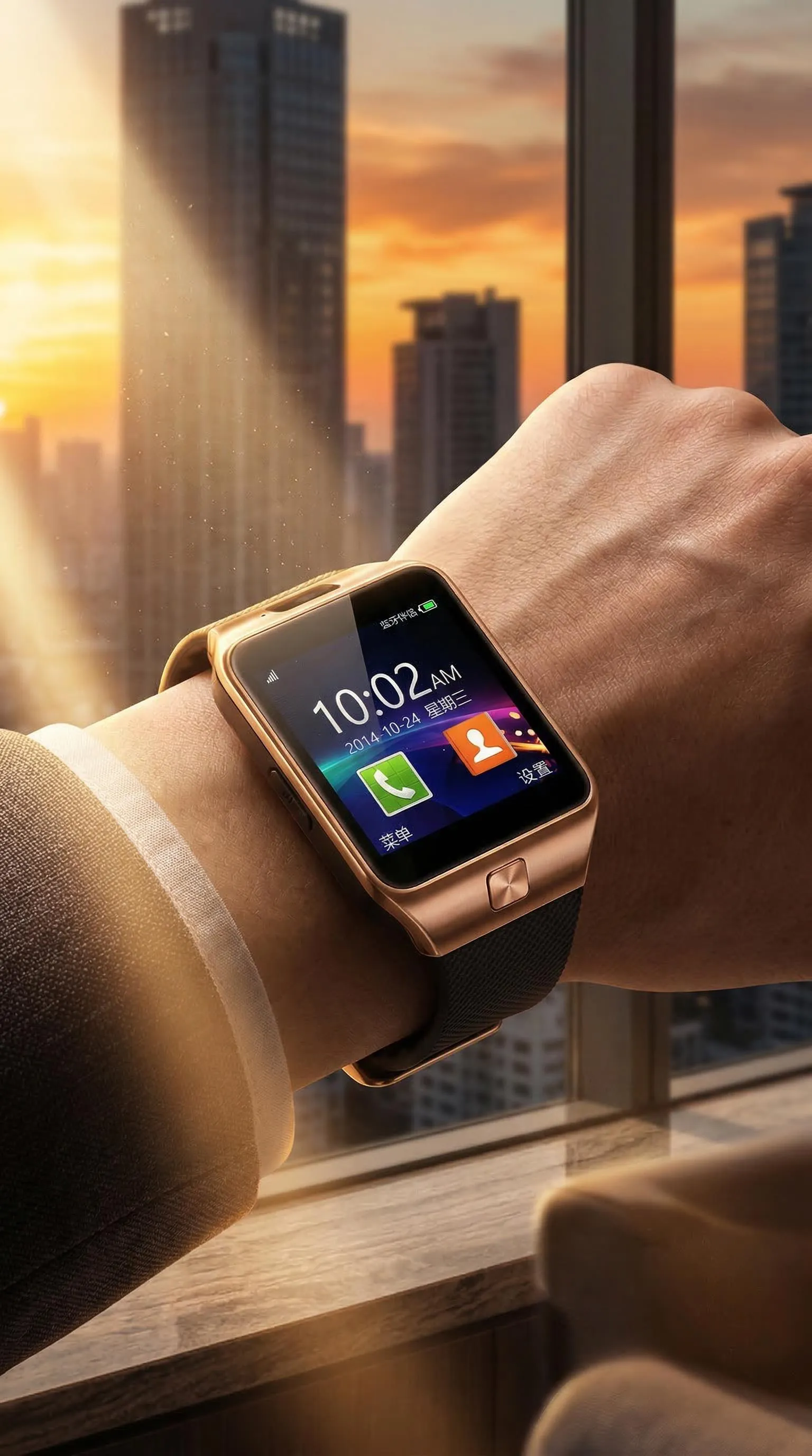 请在手表表带内侧空隙处,精准补全一只肤质细腻、骨节分明的男士左手手腕。手腕需自然穿过表带,表带与皮肤接触处需产生微小的物理压痕与自然的阴影投射。将手表后方的纯黑背景替换为高层写字楼落日余晖下的窗边远景,画面左侧需引入一道斜向的丁达尔效应体积光,精准捕捉表壳边缘的轮廓光,并增强表盘玻璃的次表面散射效果。保持手表主体各项数据参数与布局完全不变,呈现顶级时尚杂志大片画质。
