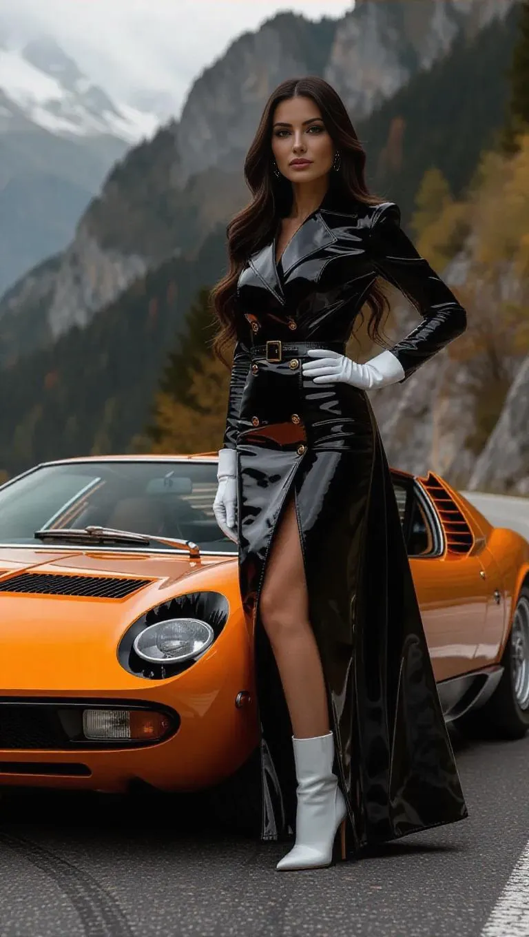 AI-generated image prompt: Stylish Italian woman with long dark hair poses elegantly beside her orange Lamborghini Miura P400 on a scenic Italian mountain road. Glossy black PVC trench coat, white high-heel shoes, and matching gloves create bold retro-futuristic fashion contrast against luxury car aesthetics. Perfect for AI art enthusiasts blending automotive glamour with avant-garde style.