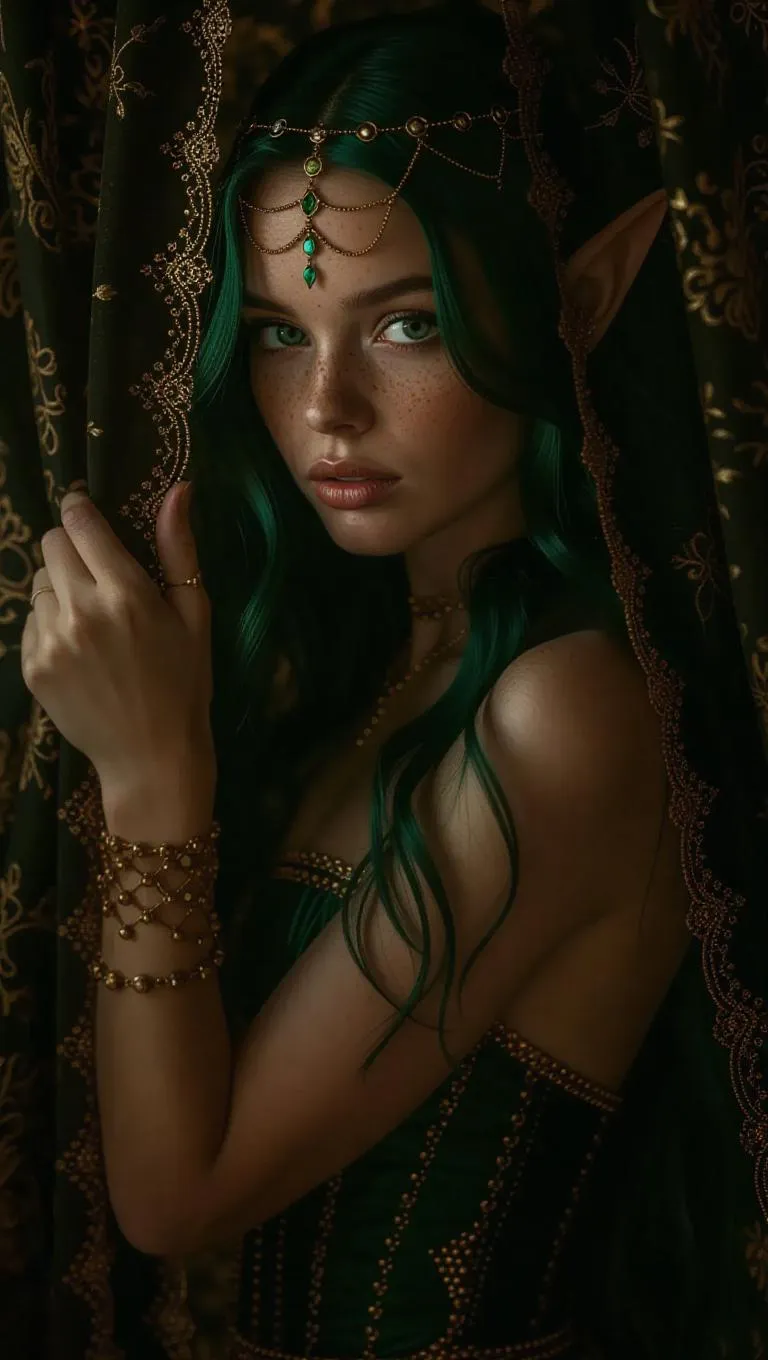 vintage fantasy art book full body elf girl with green neon hair hides behind curtain with ornament made of tiny little dots, bronze and dark green, hips, outlines
