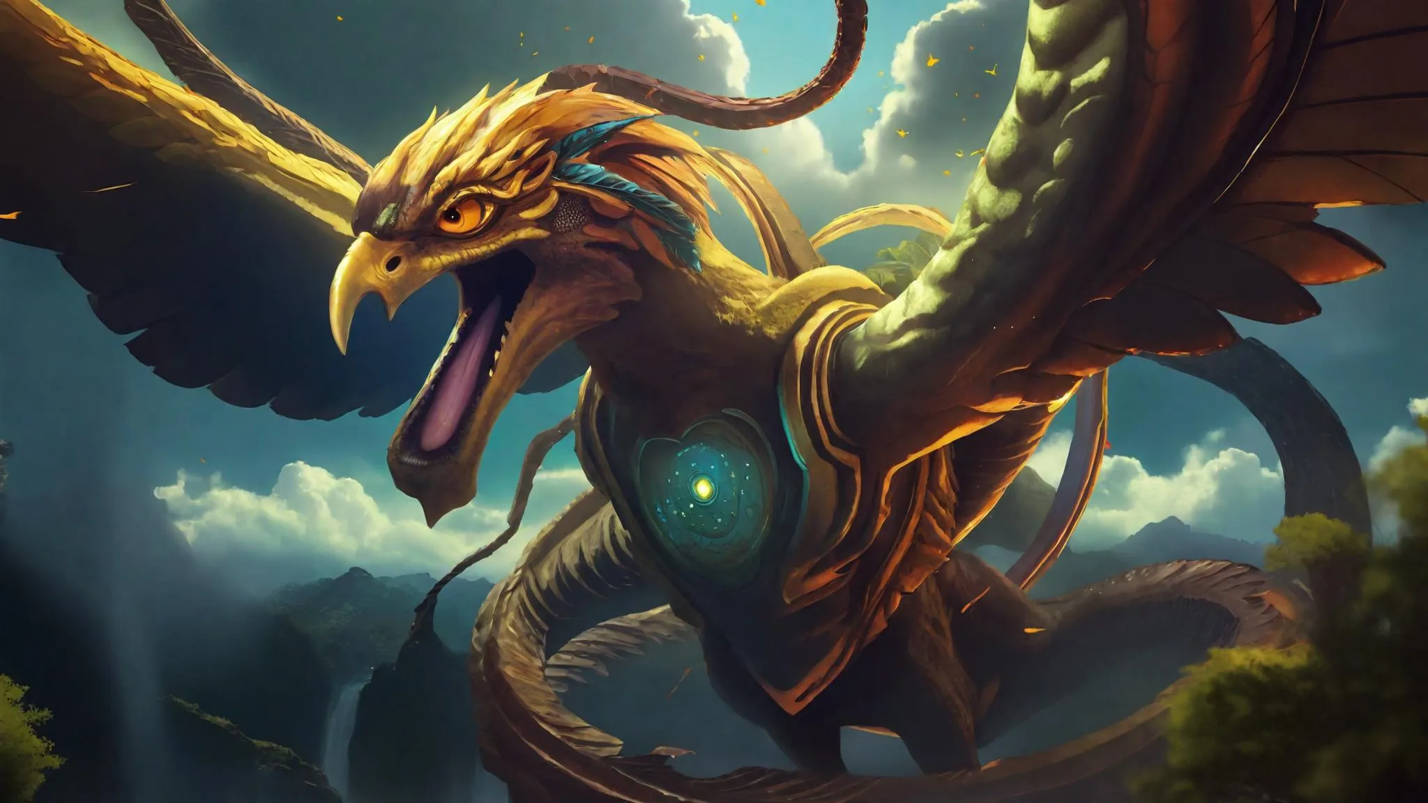 Generate stunning concept art of Kulkulkan, the winged serpent god, with AI. Transform text prompts into dynamic visuals of its gigantic serpent body soaring through vibrant skies. Explore professional-grade AI effects for captivating mythological creature designs.