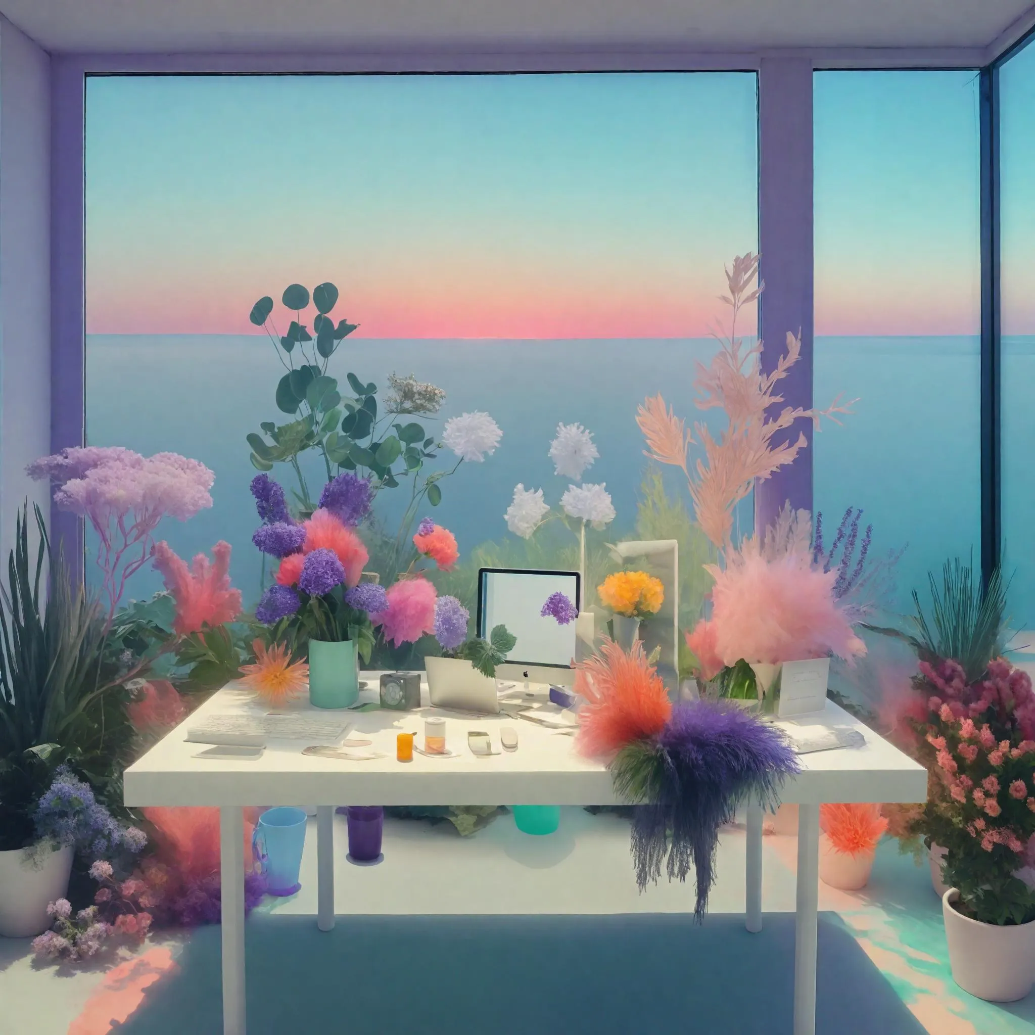A white office desk surrounded by lush, whimsical plants, with vibrant flowers spilling over the edges. The floor-to-ceiling windows frame a vast, surreal ocean beyond, where the water shimmers in unusual shades of lavender and teal. The sky above transitions into soft, otherworldly hues of deep coral and mint green, creating a sense of eerie calm. The lighting is ethereal, casting elongated shadows across the desk, highlighting the contrast between the natural and the strange. The scene is dreamlike and bizarre, with an uncanny, visually captivating color palette that evokes wonder and intrigue without any sense of fear.