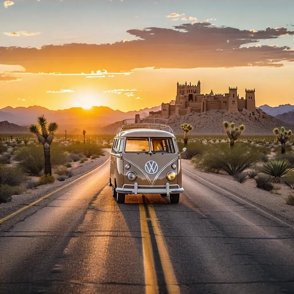 Generate a retro-futuristic 1960 VW T1 Bulli on Route 66 with vivago.ai's AI tools. Blend vintage aesthetics, urban scenery, desert oasis vibes, dunes, and medieval castle elements for surreal, nostalgic visuals. Perfect for creative projects seeking unique AI-generated retro adventure scenes.