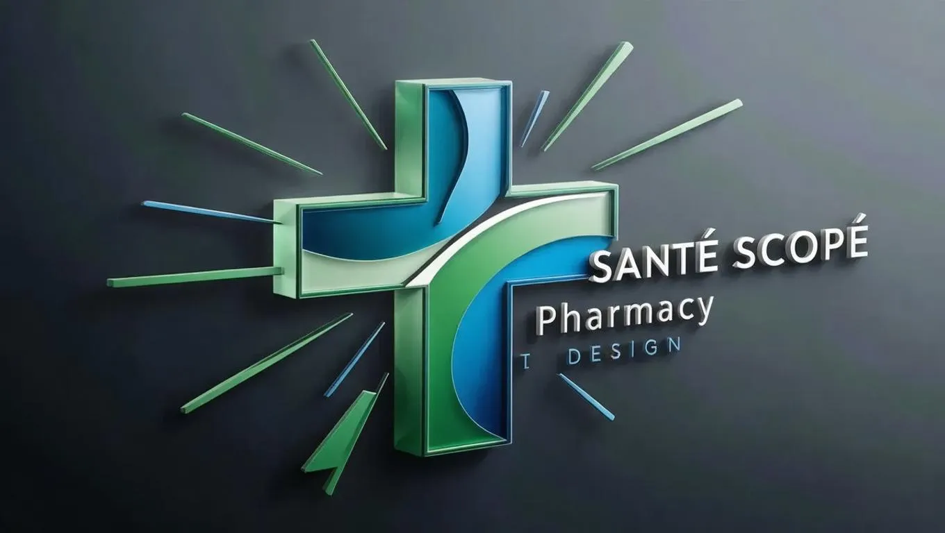 Create a professional 3D pharmacy cross logo for 'Santé Scope' using soothing green and blue gradients. Modern, clean design with smooth textures reflects medical expertise and trust. Ideal for healthcare branding and professional visual identity.