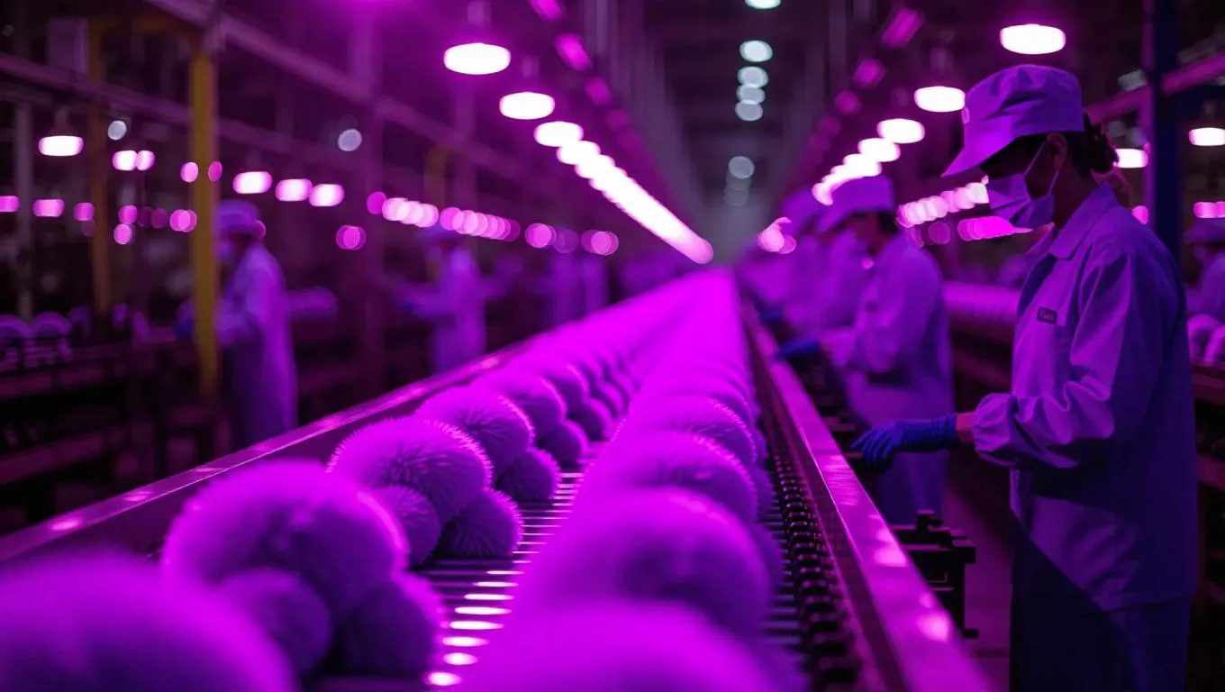 A bustling factory conveyor belt lined with a single type of purple fluffy toy, each meticulously crafted and moving rhythmically, under the glow of industrial lights, with workers in crisp uniforms overseeing the process, creating a seamless blend of modern machinery and soft, whimsical charm.
