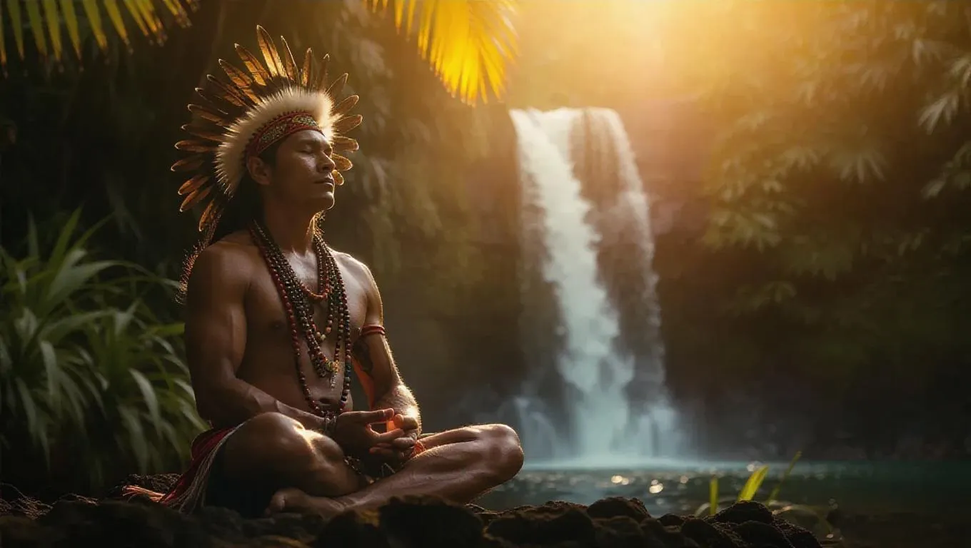Create a mystical shaman meditating in Tahiti's tropical Papenoo waterfall with healing light using Vivago.ai's AI image generator. Transform text prompts into vivid visuals of lush nature and spiritual serenity. Explore AI effects for professional-grade, ethereal artwork inspired by tropical landscapes and sacred healing energies.