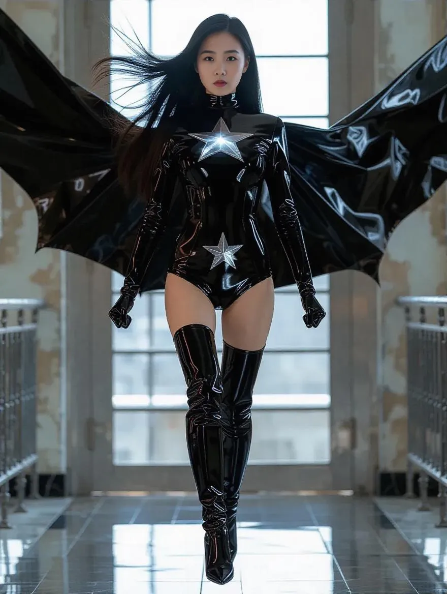 Generate a 4K HDR AI superheroine with vivago.ai: 360-degree panoramic view of a 28-year-old Chinese female villain in black patent leather cape, krypton uniform, and diamond shield. Experience smooth flight dynamics, movie-grade effects, zero distortion, and crisp reflections. Perfect AI-powered dark star character design for cinematic visuals (60fps) with professional editing tools.