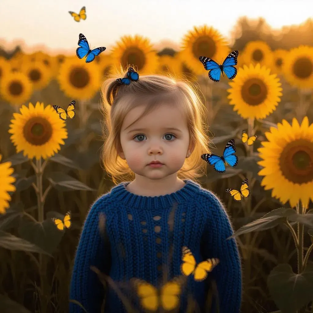 Immerse in an AI-generated scene of a lone toddler in a mystical meadow, adorned with yellow butterflies, giant blue-yellow sunflowers, and subtle sun rays. Moody, ethereal vibes meet realistic nature photography, blending nursery-book whimsy with 4K realism. Her tattered blue sweater and enigmatic aura evoke a hauntingly enchanting spectacle, merging fantasy with lifelike detail.