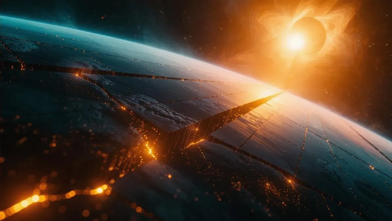 Dimensions crack, revealing the world of 2025 parallel with a planet-like world, showcasing the dimension of drama through swirling cosmic energies, fractured landscapes, and futuristic cityscapes merging with alien terrains, emphasizing the tension and intrigue, with neon lights and cybernetic elements adding a futuristic flair.