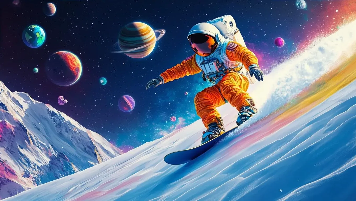 An astronaut, clad in a brightly colored suit of orange, blue, and yellow, skillfully snowboards down a vividly textured and colored mountain. Weightless and dynamic, they navigate the snowboard, which is covered in white powder, while a colorful array of celestial bodies—planets and stars—orbit around them, creating a sense of depth and motion. The scene is set against a dark blue sky speckled with distant stars, enhancing the surreal and otherworldly atmosphere. Soft, diffused lighting casts gentle highlights on the astronaut and the mountain, emphasizing the ethereal quality of the environment. The style is a blend of realism and sci-fi, capturing the magical and futuristic essence of the moment.