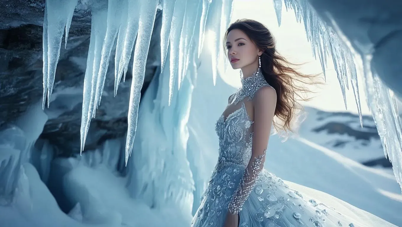 Create a stunning AI-generated image of an ethereal woman in a shimmering ice-inspired gown, embellished with pearls and intricate frost details. Set in a magical frozen landscape with glistening icicles, this AI-powered visual masterpiece combines elegance and winter wonder—crafted effortlessly using VivaGo.ai’s advanced image generation tools for professional-grade artistry.