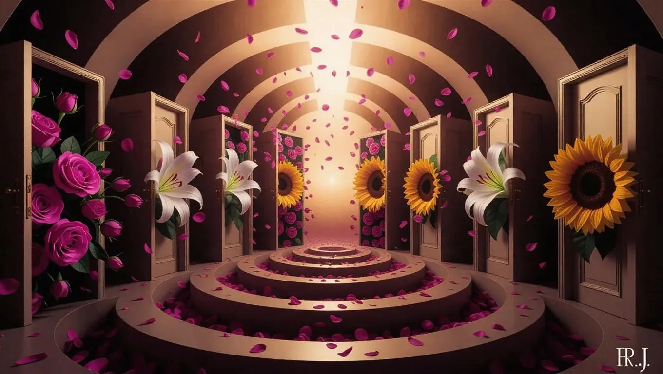 Surreal AI-generated art depicting a dreamlike scene of doors opening in an ethereal space, revealing vibrant roses, lilies, and sunflowers. Hyper-detailed fantasy realism captures floating petals in golden light, dynamic spiral composition, and cinematic floral cascade. Magical realism visuals blend with cinematic grandeur for mesmerizing, professional-grade creative transformations.