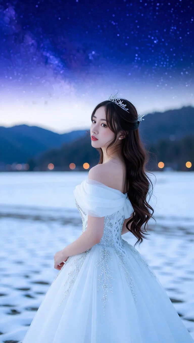Create a stunning AI-generated image of a woman in an elegant floral-adorned gown, standing in a serene snowy field under a starry night sky. Perfect for fantasy portraits, winter scenes, and ethereal visual storytelling with Vivago.ai's advanced AI art tools.