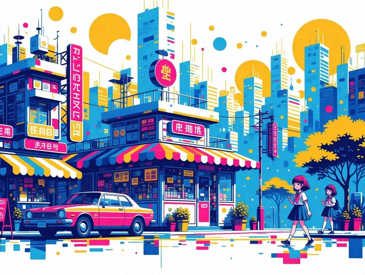 Generate retro-futuristic cityscape: Googie towers, stacked diners with scanlines and parallel lines. Cute anime schoolgirl strolls by in vibrant palette - white glass, blue textiles, mustard yellows, raspberry accents. AI-powered image creation.