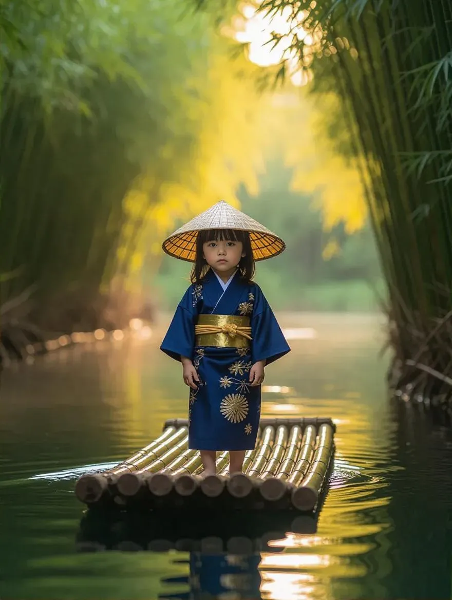 A serene AI-generated image of a toddler girl in a deep blue suikana robe and kasa straw hat, floating on a bamboo raft down a misty river. Lush bamboo forests, golden sunlight, and cinematic samurai film aesthetics create a peaceful, mysterious scene. Perfect for AI art tools specializing in traditional Japanese visuals and atmospheric storytelling.