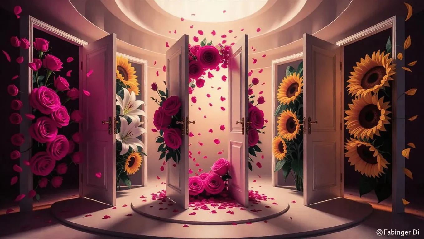 Surreal AI-generated art depicting a dreamlike scene of doors opening in an ethereal space, revealing vibrant roses, lilies, and sunflowers. Hyper-detailed fantasy realism captures floating petals in golden light, dynamic spiral composition, and cinematic floral cascade. Magical realism visuals blend with cinematic grandeur for mesmerizing, professional-grade creative transformations.