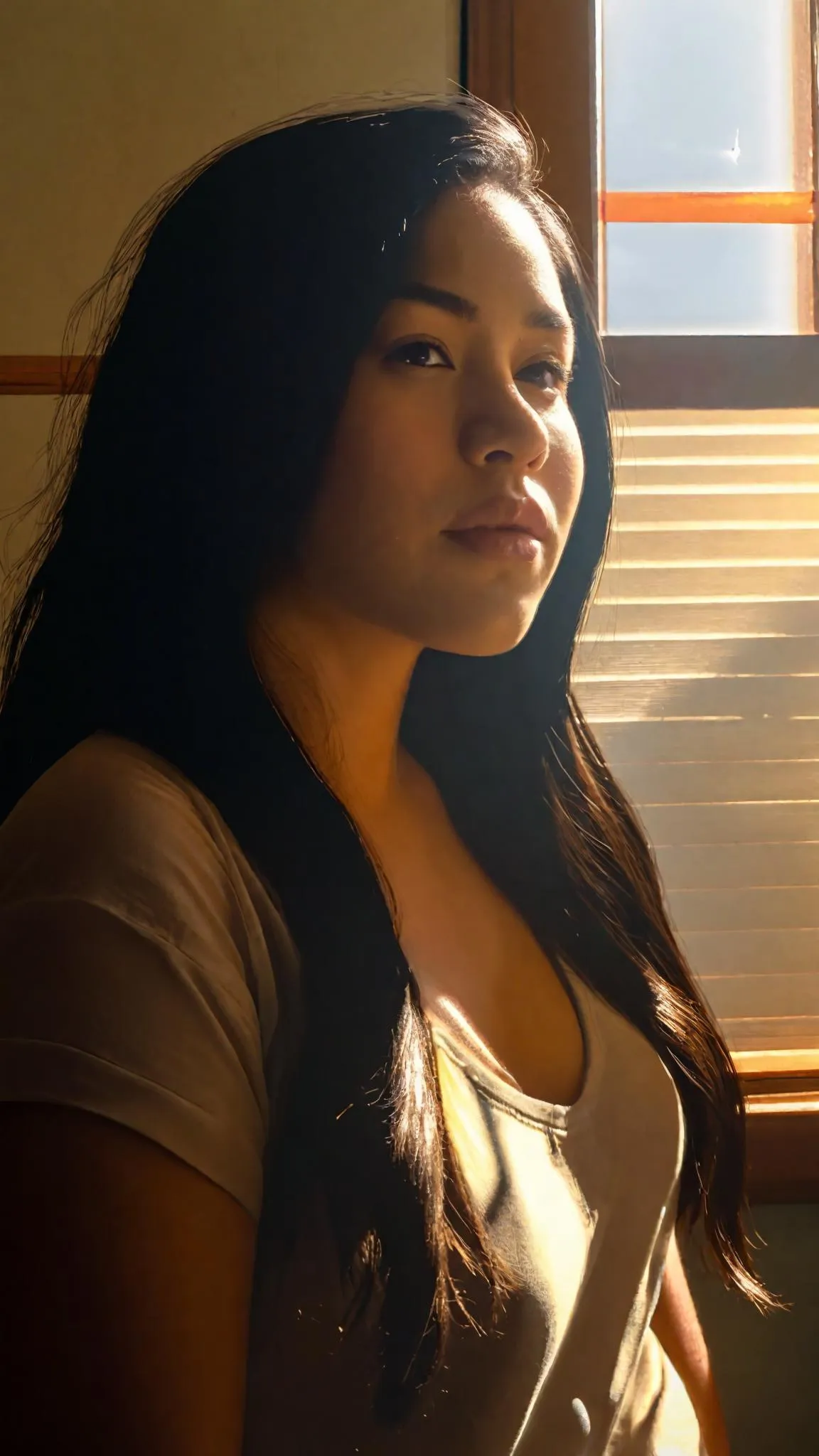 Create a multicultural teen girl AI image with Oriental-Inuit-Hispanic features, transitioning from girlhood in dystopian sleepwear. Real-life style captures her playful expression, voluptuous figure, and soft natural lighting. AI-generated visuals highlight ethnic diversity, youthful curves, and warm indoor glow for vivid, professional character art.