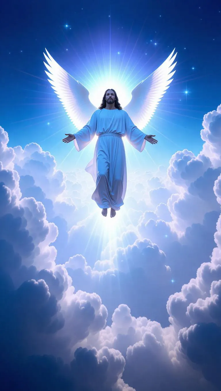 Create celestial AI art of Jesus with glowing wings amidst heavenly clouds using vivago.ai. Transform text prompts into divine visuals for spiritual content, worship materials, or inspirational designs with professional-grade AI image generation and ethereal effects.
