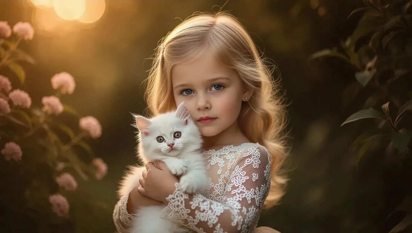 Create a realistic, magical portrait of a blonde 5-year-old girl in an intricate gown holding a fluffy kitten. Set in a dreamy forest with soft lighting, side-swept bangs, and full-body framing. AI-generated imagery captures the joyful bond between child and pet, blending elegance with enchanting natural details for professional-grade visual storytelling.