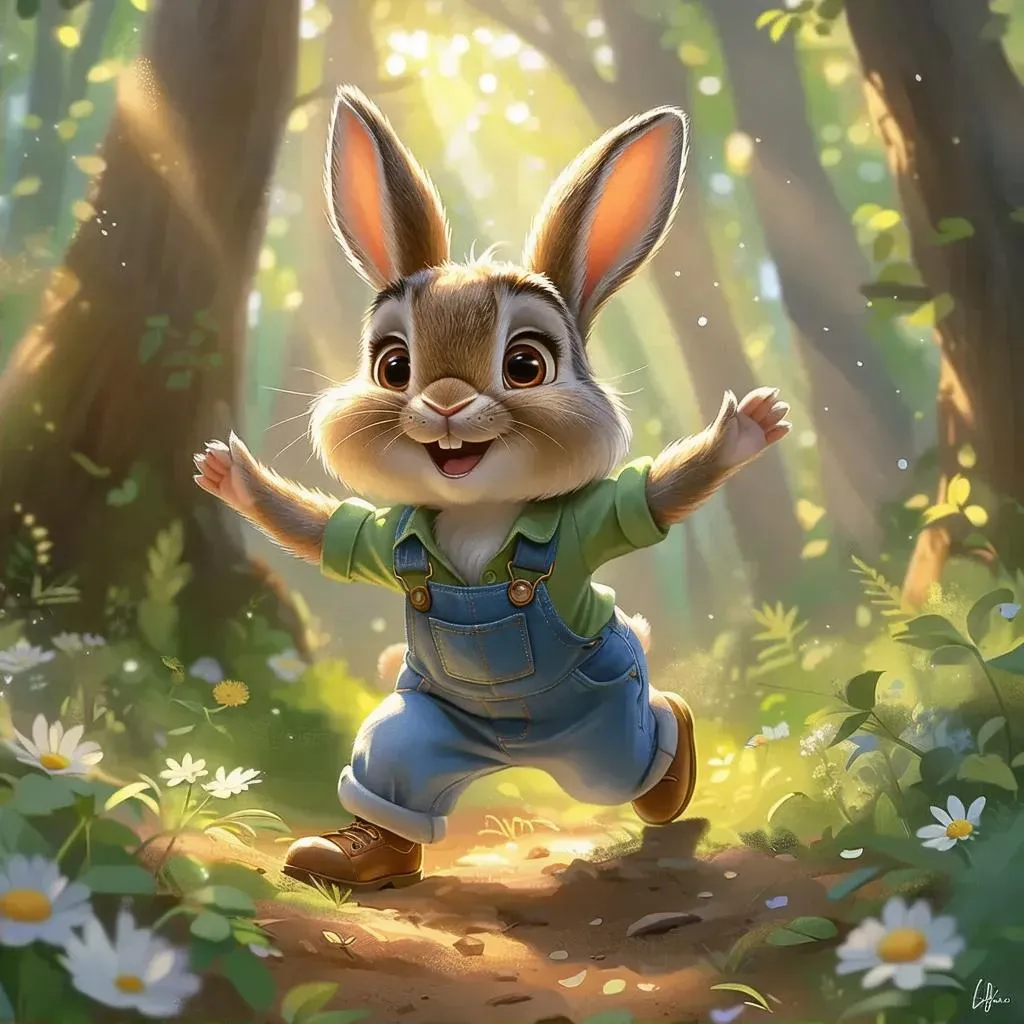 Create a charming AI-generated bunny character with fluffy white fur, big curious eyes, and a playful outfit in a sunny forest clearing. Perfect for whimsical animations or illustrations. Vivago.ai’s advanced tools transform prompts into vibrant 16:9 visuals with high detail, joyful expressions, and professional editing for captivating, cute content.