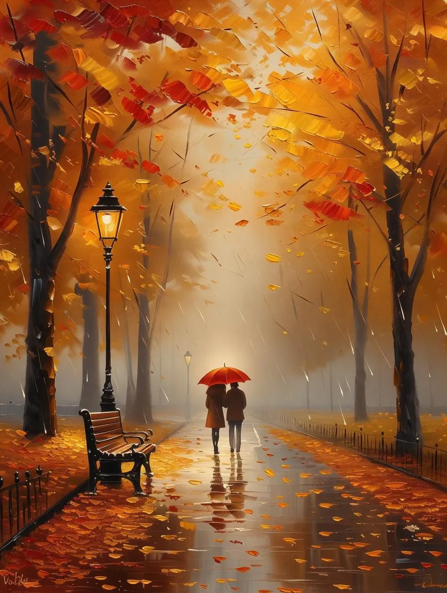Autumn park oil painting effect: Transform scenes into vibrant impressionist masterpieces with structured brushstrokes. Capture rainy-day romance—couples strolling under umbrellas amid golden foliage, grey tree trunks, and nostalgic blue skies. AI-powered impasto technique enhances autumn's intimate mood, blending vivid yellows, oranges, and textured park pathways for professional-grade artistry.