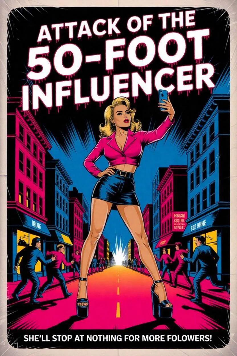 A lurid B-movie style poster for "ATTACK OF THE 50-FOOT INFLUENCER." Giant blonde woman in trendy Y2K fashion stomping through a downtown city, buildings crumbling beneath her platform heels. She's holding an enormous smartphone, taking a selfie while pouting as people flee in terror below. Dramatic lighting with neon pinks and blues. Bold retro typography at the top reading "ATTACK OF THE 50-FOOT INFLUENCER" in dripping font. Tagline: "She'll Stop at Nothing for More Followers!" Classic pulp comic art style with exaggerated proportions and high contrast colors. Small terrified social media executives in the corner. Helicopter circling her head with a spotlight. Sky has an ominous sunset gradient.