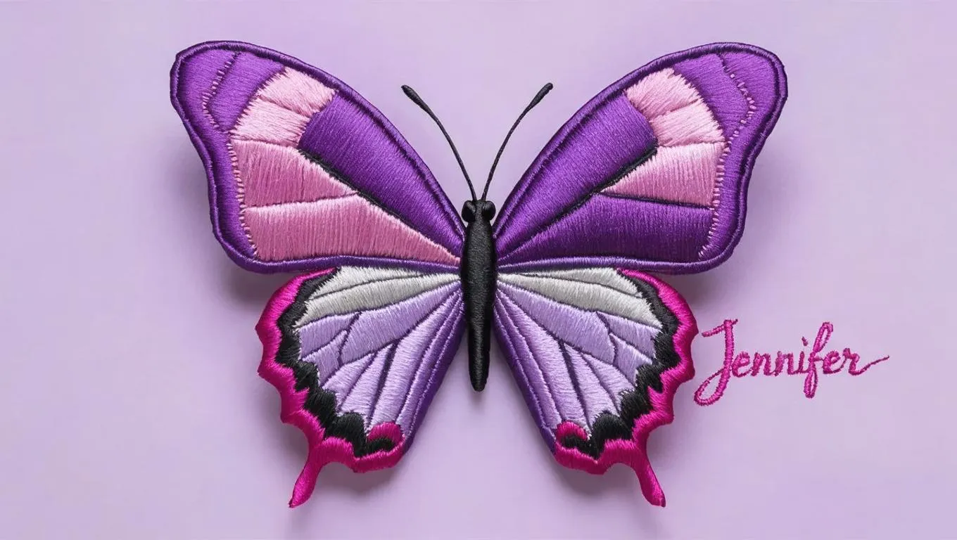 Create a stunning AI-generated stitched butterfly design with gradient purple hues and a bold pink "Jennifer" signature on the right wing. Perfect for personalized art, custom embroidery inspiration, and unique digital creations using vivago.ai's AI image tools for professional, eye-catching visuals.