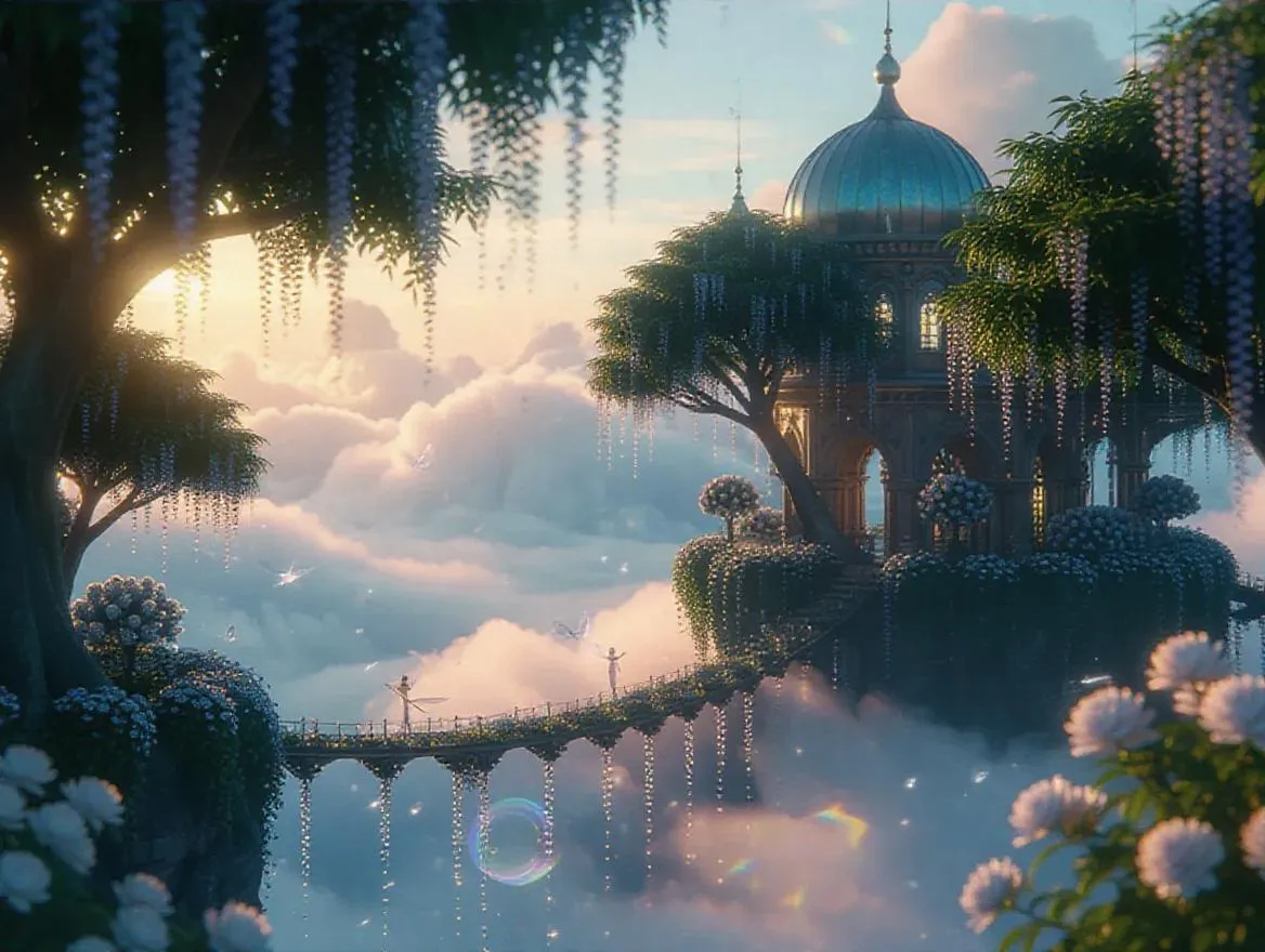 A serene floating civilization atop billowing clouds, luminescent trees with translucent leaves swaying gently, branches cradling liquid opal blossoms. Bioluminescent birds with ribbon-like tails glide among floating gardens of giant peonies and stardust-dripping wisteria vines. Delicate light bridges connect airy pavilions with iridescent domes, tiny fairies with dragonfly wings dancing around crystal fountains spraying diamond mist. Soft sunlight filters through the mist, casting rainbow halos around cloud-sculpted towers adorned with celestial wind chimes. Wide-angle view with ethereal bokeh, pastel lilac, peach, seafoam green.