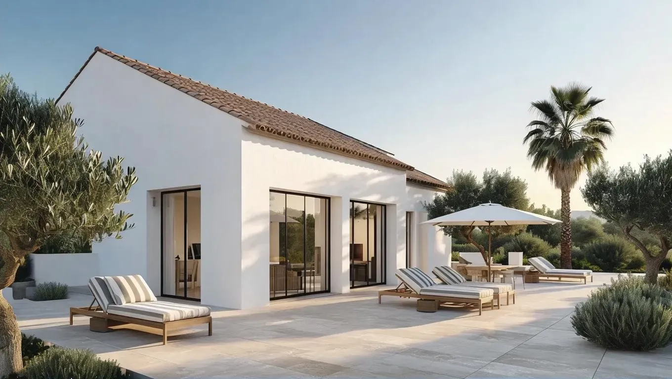 Generate a modern Provencal-style villa AI image with white facade, terracotta roof, and Mediterranean landscaping. Create serene terrace views featuring parasol pines and olive trees under perfect natural lighting using Vivago.ai's AI architecture visualization tools for realistic neo-bastide designs.