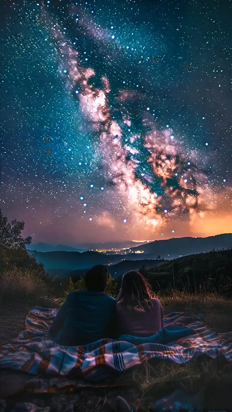 Experience a romantic stargazing getaway on a secluded hilltop. A couple lies on a blanket under a clear, starry sky, marveling at constellations shimmering above. Perfect for AI-generated visuals of serene, celestial moments and peaceful night escapes.