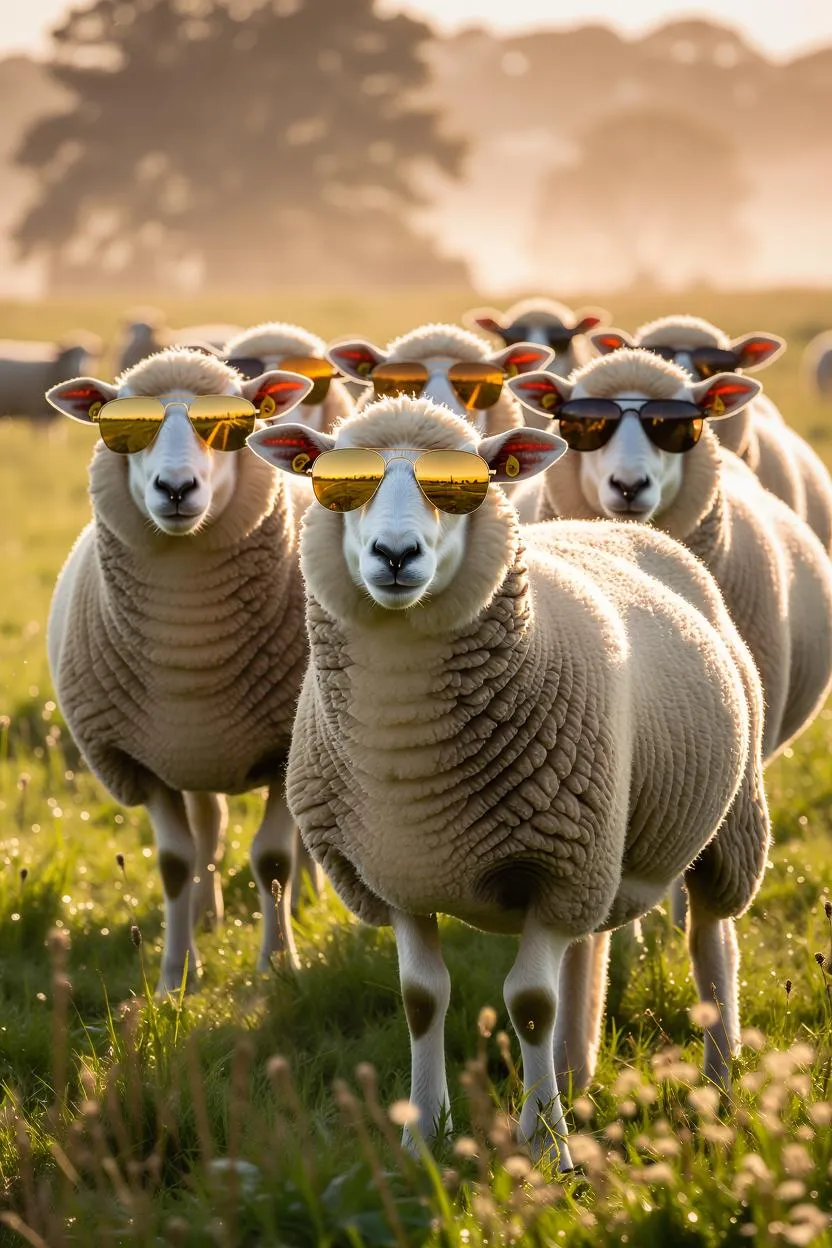 In a dew-soaked meadow bathed in soft morning mist, a group of sheep stands motionless under diffused golden light. Each wears distinct, fashion-forward sunglasses—retro gold rims, gradient tints, and bold angular shapes—transforming them into a composed ensemble of silent icons. The central sheep, slightly forward, gazes calmly into the lens, exuding quiet authority. Mist curls around their hooves, and rim light outlines the wool with luminous texture. This surreal pastoral scene blends National Geographic's tactile realism with the quiet strangeness of contemporary art photography, meditating on collective identity, stillness, and the absurd elegance of the everyday.