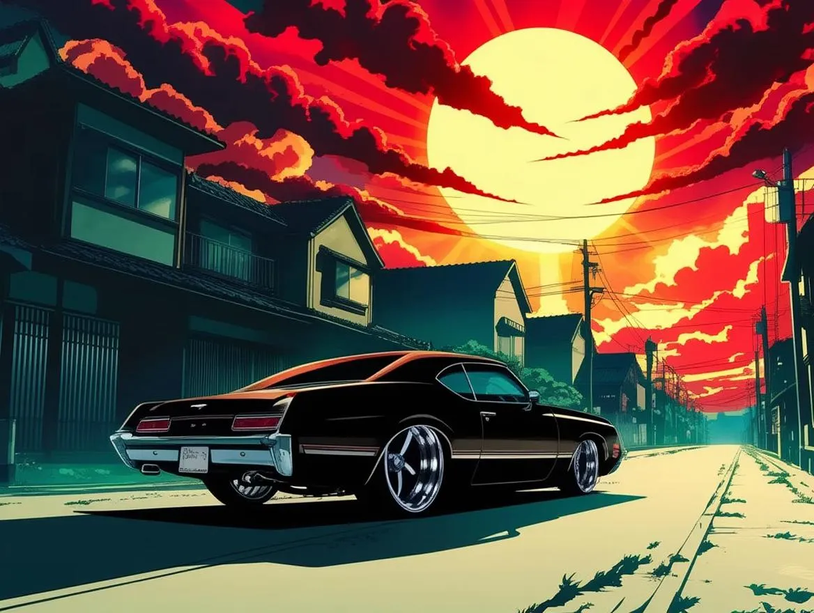 Generate striking AI Anime scenery with vivago.ai: a moody dark neighborhood under fiery red-orange clouds, sunbeams piercing through, featuring a sleek vintage black car rolling on 24-inch rims. Perfect for dynamic AI-generated visuals, blending dramatic skies, retro aesthetics, and immersive anime-style atmosphere for professional storytelling.