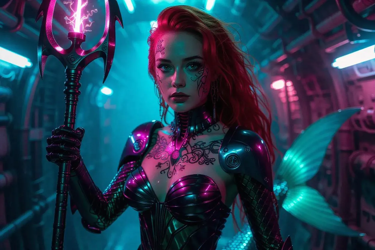 Cyberpunk Ariel merges aquatic myth with neon futurism in this AI-generated art. Featuring bioluminescent jade scales, cybernetic prosthetics, and plasma trident within a holographic submarine metropolis. Perfect for sci-fi fantasy visuals blending Shadowrun aesthetics, mechanical augmentation, and marine bioluminescence. Create striking cyber-mermaid designs with AI-powered precision for dynamic combat-ready character art.