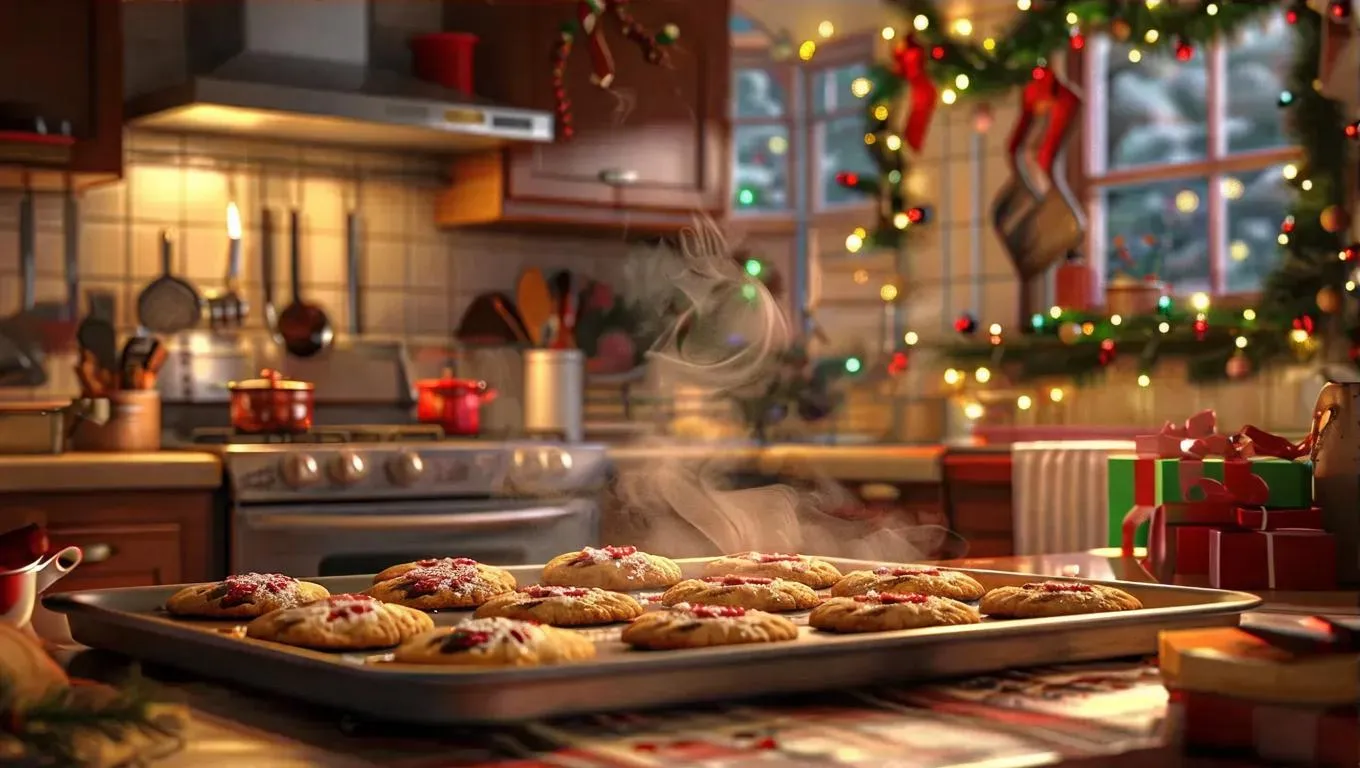 Generate a cozy Pixar-style Christmas kitchen scene with AI. Vivago.ai crafts steaming cookies on a tray, fresh from the oven, amidst festive twinkling lights. Transform text into vibrant animations using AI image tools for heartwarming holiday visuals. Perfect for professional-grade festive content creation.