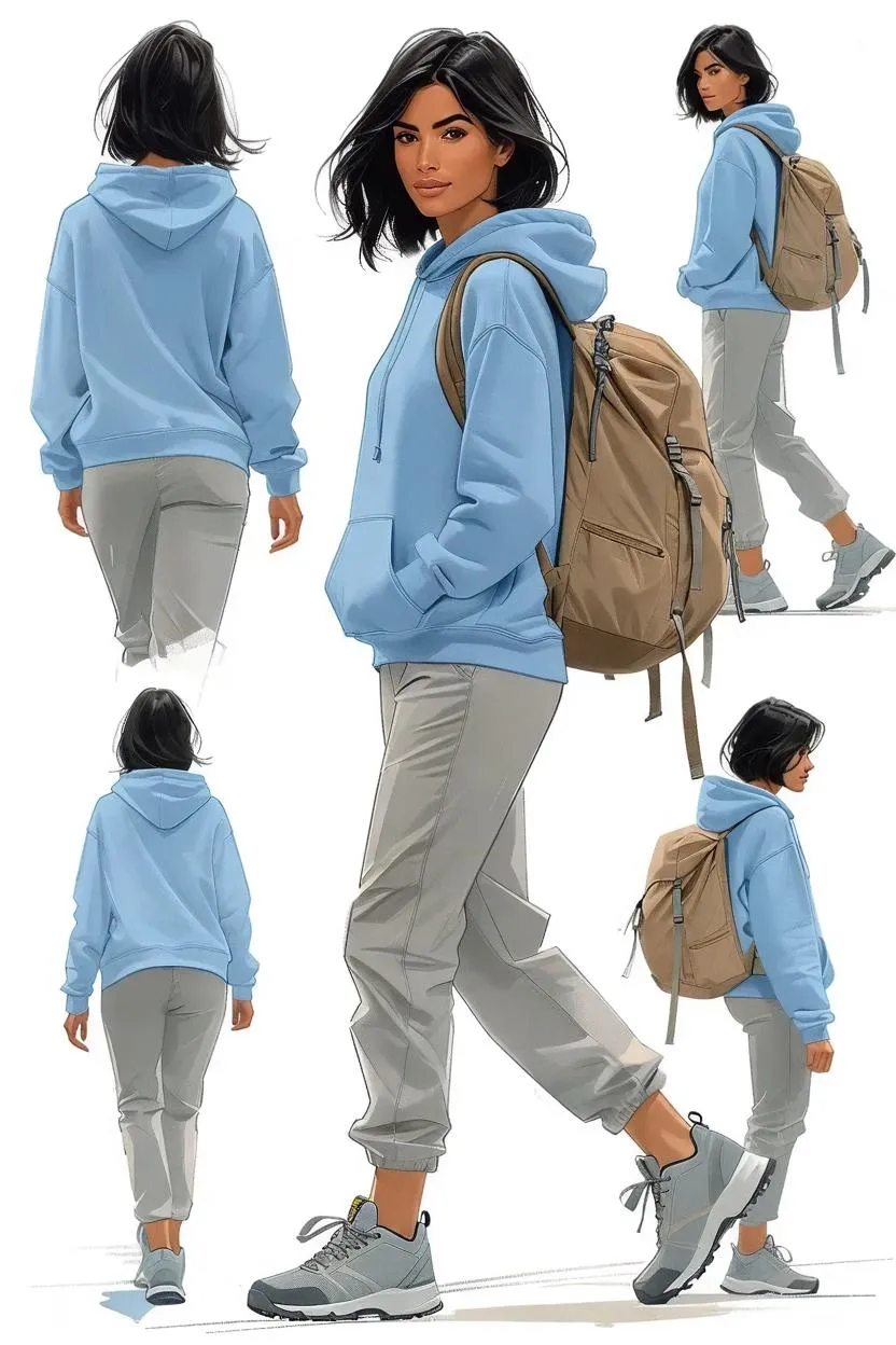 Generate AI art in Greg Capullo's sketch style: a 22-year-old woman with short black hair, pastel blue hoodie, grey hiking pants, and backpack. AI-powered tools create dynamic full-body poses, multiple gestures, and expressions while walking, enhanced by dramatic Rembrandt lighting on white backgrounds for professional-grade visual storytelling.