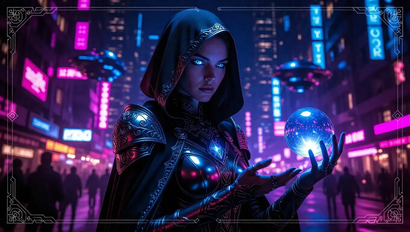 A stoic sorceress with brilliant white eyes, wearing a silver cloak and ornate armor, holds a glowing crystal orb while standing in a futuristic city. Neon lights and floating vehicles create a sci-fi ambiance. The card border features circuit and star motifs, accented with silver and bright colors, and adorned with diamond.